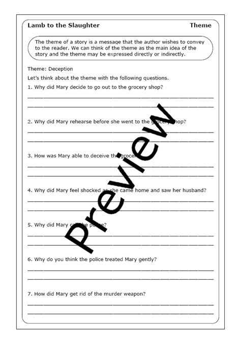 Lamb to the Slaughter worksheets are an important part of any lesson on the story. They provide an opportunity for students to explore the themes and characters of the story in a structured way. There are a variety of worksheets available online, ranging from simple fill-in-the-blank exercises to more complex activities that require critical thinking and analysis. By using worksheets, teachers can ensure that students are engaging with the text and gaining a deeper understanding of the story.